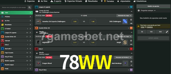 A aposta 78WW oferece aos jogadores a experiência mais conveniente de apostas em eSports!